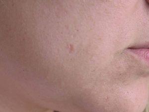 Fig. 2.--Lesión papulosa anular, de coloración similar a la piel, de bordes elevados y de centro ligeramente deprimido, localizada en la región supralabial derecha, correspondiente a la paciente del caso clínico 2.