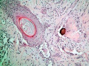 El estudio histopatológico de ambas lesiones fue superponible totalmente a las 2 pacientes, apreciándose una tumoración dérmica, no encapsulada, compuesta por un estroma desmoplásico que ocupa la parte superior de la dermis (fig. 3) y por cordones y nidos de células basaloides. También se pueden apreciar quistes infundibulares rellenos de queratina hojaldrada basófila entremezclados con los cordones basaloides (fig. 4). Rodeando a estos cordones y a los nidos epiteliales se pueden apreciar anillos de colágeno eosinófilo y esclerótico (fig. 5).