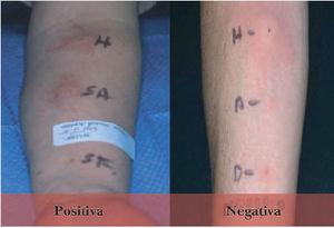 Prueba del suero autólogoLa prueba del suero autólogo es útil para el rastreo in vivo de la presencia de autoanticuerpos en el suero de pacientes afectados de urticaria crónica capaces de liberar histamina. Tiene una sensibilidad y especificidad del 80 %. Se basa en poner en contacto proteínas intravasculares de elevado peso molecular al contacto directo con mastocitos extravasculares. El suero a probar se obtiene de sangre recogida en un tubo sin aditivos, reposada a temperatura ambiente (15 min) y posteriormente centrifugada a 5.000 g (15 min). Se inyectan 50 l de suero intradérmicamente en la zona volar del antebrazo evitando las zonas donde 24 h antes había habones. El control positivo es histamina y el negativo solución salina isotónica. La prueba se valora como positiva si se produce un habón en el punto de inyección de 1,5 mm de diámetro superior a la reacción observada en el punto de inoculación del suero salino, en la lectura practicada a los 30 min (fig. 1)13 .