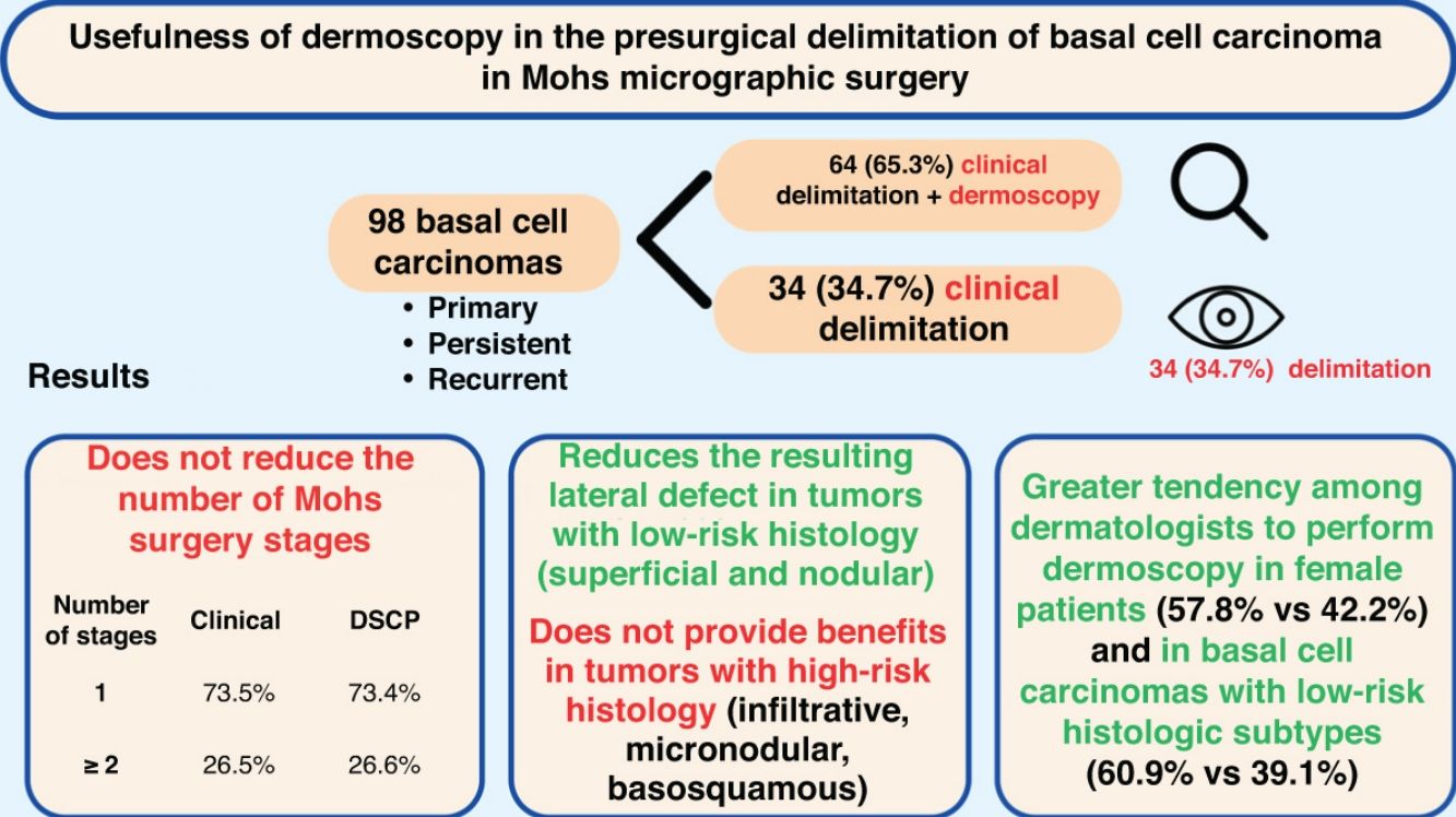 Dermoscopy is a widely used non-invasive technique for the clinical diagnosis of basal cell carcinoma. It has been reported that its use in the preoperative delineation of basal cell carcinoma in Mohs micrographic surgery can help reduce the number of steps required to obtain negative margins and decreases the resulting surgical defect. This prospective single-center study in 98 patients found that dermoscopy helps reduce the resulting surgical defect compared to delimitation by visual inspection alone in basal cell carcinomas with low-risk histologic subtypes (superficial and nodular), although it does not reduce the number of Mohs micrographic surgery steps. Its use does not provide benefits in tumors with high-risk histology. A greater tendency of dermatologists to perform pre-surgical delimitation with dermoscopy has been observed in low-risk subtypes and in female patients.