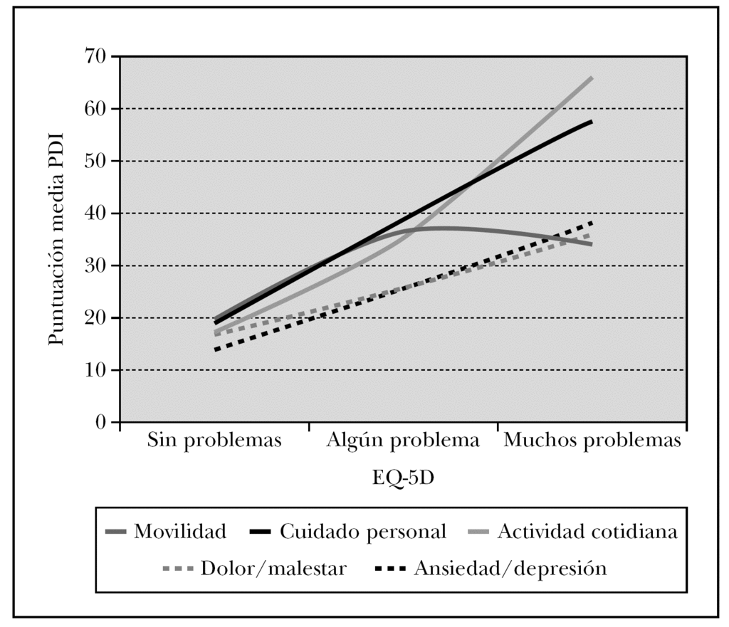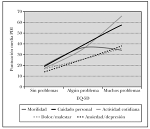 Fig. 2.--Puntuaciones medias del cuestionario PDI según las dimen- siones del cuestionario EQ-5D.