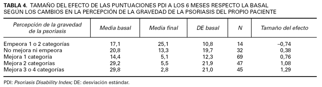 Resultan especialmente interesantes los resultados de este último trabajo porque utilizan una metodología muy similar a nuestro estudio: los sujetos del estudio también son pacientes que inician tratamiento terapéutico y en ellos se tiene en cuenta, además de la calidad de vida relacionada con la salud y el PASI, la percepción de la eficacia y la tolerabilidad del tratamiento por parte del propio paciente y del médico. En ambos trabajos, las puntuaciones del PDI y el PASI mejoran de manera progresiva. El tamaño del efecto muestra una puntuación similar y el cuestionario muestra correlaciones de forma estadísticamente significativa con las percepciones de los pacientes y médicos acerca de la tolerabilidad y eficacia del tratamiento.
