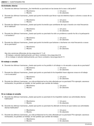 El PDI es un cuestionario específico para evaluar la calidad de vida de los pacientes con psoriasis (anexo 1). En su versión original ha mostrado unas buenas propiedades de medición. Consta de 15 ítems distribuidos en cinco dimensiones: actividades diarias (5 ítems), trabajo/estudios (3 ítems), relaciones personales (2 ítems), ocio (4 ítems) y tratamiento (1 ítem). La categoría de respuesta va de 0 (interferencia nula de la psoriasis) a 3 (interferencia máxima de la psoriasis), y su rango de puntuación total va de 0 a 45 (a mayor puntuación, mayor impacto en la calidad de vida). El proceso de traducción y adaptación cultural del cuestionario al español se fundamentó en el método de las traducciones y retrotraducciones por sujetos bilingües con experiencia previa en la adaptación de cuestionarios 12 (informe no publicado). La adaptación cultural al español fue autorizada por el autor original del cuestionario, el cual también participó en el proceso. El cuestionario adaptado al español puede también localizarse en la página web http://www. dermatology.org.uk/index.asp?portal/quality/public.html (última fecha de acceso 24/11/05).