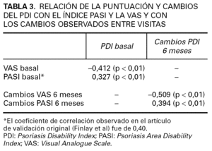 Se observó mayor impacto en la calidad de vida (más puntuación en el cuestionario PDI) en aquellos pacientes más graves (más puntuación en el PASI) (r = 0,33; p < 0,01).