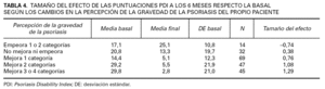 Otros instrumentos para medir la CVRS en pacientes con afecciones dermatológicas como el DLQI han mostrado, en su puntuación global, una magnitud algo menor (tamaño del efecto = 0,58) en pacientes con psoriasis 20.