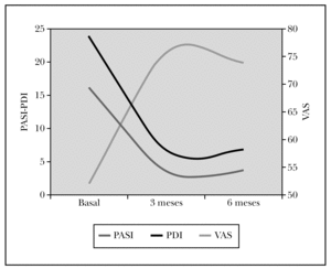 Fig. 3.--Evolución de PASI, PDI y VAS en los pacientes con psoriasis.