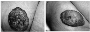 Fig. 2.--A: hemangioma ulcerado en nalga antes del tratamiento con láser. B: reepitelización tras tres sesiones con láser.