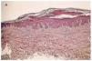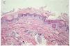 La paraqueratosis (fig. 7) es, como decíamos antes, la más frecuente alteración de la queratinización ya que se encuentra tanto en procesos inflamatorios (dermatitis, NEVIL), como eritematodescamativos (psoriasis, pitiriasis rubra pilaris) o neoplásicos (queratosis actínica, Bowen), siempre como una manifestación de una epidermopoiesis acelerada. En esa aceleración los queratinocitos espinosos pasan directamente a formar una capa córnea incompleta (con núcleos) sin pasar por la fase previa de células granulosa, de manera que siempre se asocian paraqueratosis y atrofia, o desaparición, de la capa granulosa; también suele asociarse a acantosis, ya que la hiperproliferación epidérmica produce un aumento del número de capas de células espinosas. La córnea paraqueratósica es siempre eosinófila por lo que, dada la enorme frecuencia de este trastorno, si siempre que veamos a pequeño aumento una córnea eosinófila decimos que es paraqueratósica nuestro índice de aciertos será elevadísimo.