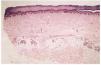 Vimos antes que la córnea ortoqueratósica laminar también es eosinófila (fig. 6), pero ese tipo de queratinización, como luego veremos, se produce en muy pocos procesos cutáneos. En otra circunstancia, la capa córnea puede ser eosinófila sin ser paraqueratósica: la capa córnea normal de palmas y plantas es siempre compacta, pero unas veces es basófila (fig. 3) y otras eosinófila (fig. 4). Y estos dos tipos de córnea compacta no sólo se diferencian por su apentecia tintorial, sino también por su estructura; cuando es basófila se distinguen en ella perfectamente los límites celulares de los corneocitos y en su centro la «huella», menos basófila, del núcleo desaparacido (fig. 3); cuando es eosinófila apenas se distinguen los límites celulares y no se aprecia la «huella» nuclear (fig. 4). No hemos podido saber a qué se deben estas diferencias de estructura y tinción en zonas normales de las mismas características. Incluso no es infrecuente ver las dos tinciones (y estructuras) en el mismo corte (fig. 8).
