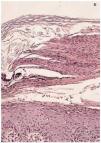 FIG. 7.--Capa córnea paraqueratósica. Es siempre eosinófila y coincide con atrofia o desaparición de la granulosa. En este caso es una psoriasis; la gran acumulación de núcleos de la mitad inferior de la córnea de B corresponde a neutrófilos (microabsceso de Munro). Los demás restos nucleares, en forma de pequeños trazos horizontales, son los núcleos picnóticos característicos de la paraqueratosis. (Hematoxilina-eosima, x40, x200).