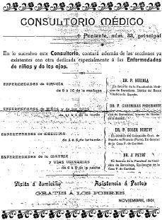 Hacia 1901 comenzó su actividad privada como especialista en «enfermedades de la matriz y las vías urinarias» en un consultorio compartido con sus compañeros los doctores Pere Nubiola, Frederic Corominas i Pedemonte, Soler i Bertot y Ramón Torres i Casanovas (Fig. 5). A pesar de contar con cuatro figuras destacadas --tres de ellos serían más tarde catedráticos y dos de ellos presidentes de la Real Acadèmia--tuvieron que cerrarlo por falta de clientela. Posteriormente se estableció en la calle Lauria, número 81, anunciando una dedicación «a partos». En 1906 trasladó su actividad a la calle Lauria, número 53, hasta que en 1922 se instaló definitivamente en la calle Aragón, número 270. Durante sus casi 50 años de ejercicio adquirió un gran prestigio profesional como dermatovenereólogo, disfrutando de una abundante clientela y siendo requerido frecuentemente a consulta por médicos diversos.