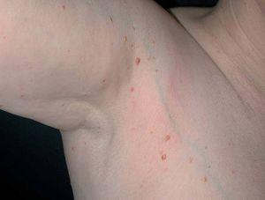 Fig. 1.—Lesiones papulosas de pocos milímetros, amarillo-parduzcas, distribuidas en tronco y zona proximal de extremidades.