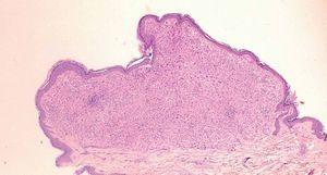 El estudio histológico de las lesiones es característico, con hallazgos similares a los encontrados en la forma juvenil y con una inmunohistoquímica que permite diferenciarlo sin problemas de las formas más agresivas de histiocitosis de células de Langerhans (HCL)9,10 . Consiste en la presencia de un infiltrado denso linfohistiocitario bien circunscrito en dermis papilar, que puede ocupar la totalidad de la dermis. En las fases más tempranas se observa un infiltrado histiocítico monomorfo, sin lípidos. En fases más tardías, cuando las lesiones están más evolucionadas, se aprecian en el infiltrado células espumosas, que corresponden a histiocitos cargados de lípidos, junto con células gigantes tipo Touton y tipo reactivas a cuerpo extraño. Acompañando a este infiltrado hay también cantidades variables de linfocitos, eosinófilos y neutrófilos. En las formas más avanzadas puede haber fibrosis. En el estudio inmunohistoquímico, los marcadores de células macrofágicas, CD68 y HAM56 son positivos, así como el marcador de dendrocitos dérmicos FXIIIa, mientras que los marcadores de células de Langerhans S100 y CD1a resultan negativos. En el estudio ultraestructural no se encuentran gránulos de Birbeck en el interior de las células.