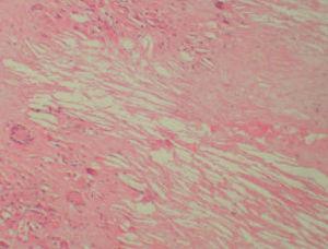Fig. 3.—Infiltrado localizado en dermis en el que se aprecia necrobiosis y la presencia en la misma de unos espacios claros (espacios claros aciculares de colesterol). (Hematoxilina-eosina, ×100.)