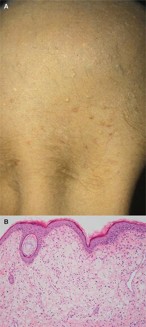 Durante el tercer ciclo de quimioterapia el paciente presentó nuevas lesiones cutáneas, tras haber cedido las iniciales, en forma de xantomas planos localizados en cara, espalda y pliegues interdigitales que se atribuyeron a su hipercolesterolemia (fig. 2A). Cinco meses después, persistiendo estas lesiones, se realizó biopsia de una de ellas y se objetivó una lesión bien delimitada en la dermis papilar constituida por una proliferación de histiocitos xantomizados, CD68 positivos y S100 y CD1a negativos, que se interpretaron como xantoma (fig. 2B).