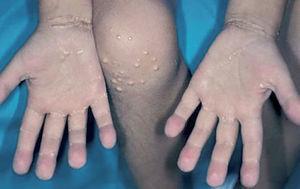 Tras un año de remisión de la enfermedad cutánea y pulmonar específica, cuando el niño tenía 3 años y 7 meses de edad, se produjo una recidiva del cuadro en forma de lesión osteolítica occipital y nuevas lesiones papulosas y costrosas en el cuero cabelludo, que desaparecieron con la administración de tratamiento con quimioterapia. Los xantomas siguieron su curso apareciendo sobre tuberosidades óseas, ambas palmas y cicatrices (figs. 3 y 4), con hipercolesterolemia y concentraciones de triglicéridos en el límite alto de la normalidad. La cirrosis biliar marcó el pronóstico ominoso del cuadro, falleciendo el paciente a los 5 años del inicio de su enfermedad.