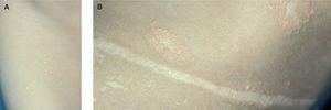 En ese momento se remitió al paciente al Servicio de Dermatología por lesiones en el cuero cabelludo presentes desde el nacimiento y que cursaban con brotes, a las que se añadieron otras, en el tronco y el cuero cabelludo, en forma de múltiples pápulas amarillentas redondeadas, de pequeño tamaño, de superficie escamosa y costrosa, que igualmente afectaban a los pliegues axilares e inguinales (fig. 1A). El estudio histológico evidenció un infiltrado histiocitario difuso en la dermis papilar, próximo a la unión dermoepidérmica, con escasos linfocitos y algunos eosinófilos, que en determinadas zonas invaden la epidermis y la ulceran. Los histiocitos presentaban un citoplasma ligeramente eosinófilo y un núcleo irregular, con hendidura central longitudinal, sin atipias o formas multinucleadas (fig. 1B). En el estudio inmunohistoquímico se confirmó que esta población celular era compatible con células de Langerhans (CD4+, CD1a+, S100+) y en la microscopia electrónica se observaron células histiocitarias con microvellosidades largas y numerosas, citoplasma abundante con múltiples organelas y cuerpos de Birbeck, y el núcleo era grande, indentado, con cromatina dispuesta periféricamente y nucleolo visibles, lo que confirmó el diagnóstico de proliferación de células de Langerhans.